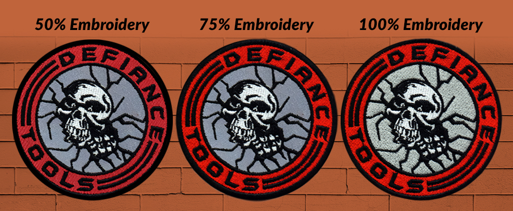 We can make embroidered patches with custom shapes as large as 16 inches, and as small as an inch. Large embroidered patches can easily incorporate complex patterns with different fonts and colors of text. Trying to associate the same amount of complex images and text clarity in a much smaller embroidered patch might not be very practical.